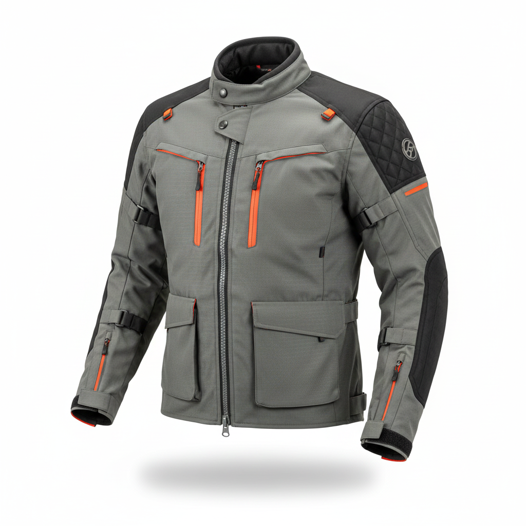Introducing the Adventurer Pro All-Season Motorbike Jacket, engineered for the discerning rider tackling touring, adventure, and daily commuting in varied conditions. This rugged jacket combines a durable, textured grey textile shell with black reinforcements and striking Hi-Vis Orange accents, offering essential protection, superior functionality, and a distinctive, ready-for-anything aesthetic.