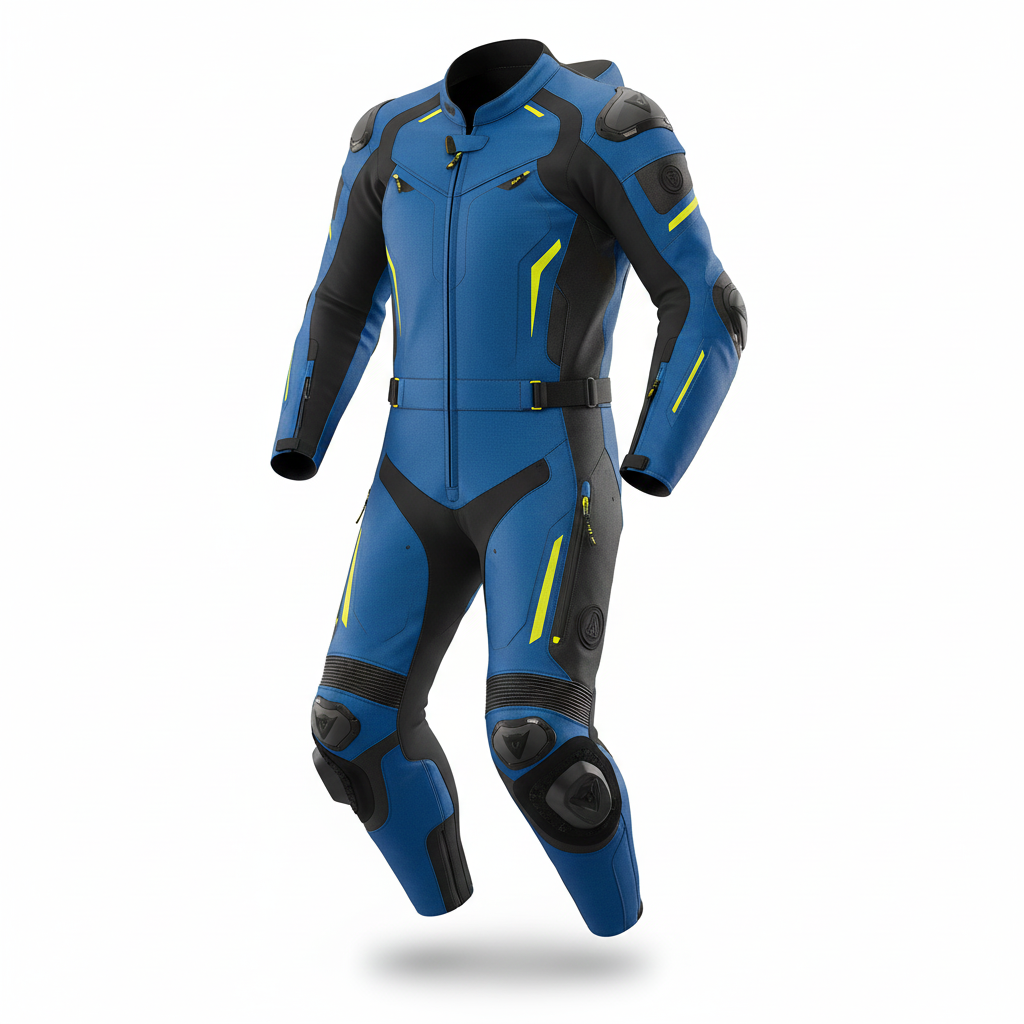 Introducing the Apex Pro Racing One-Piece Motorbike Suit, the ultimate full-body protection engineered for dedicated track riders and performance enthusiasts. This suit combines a dynamic royal blue main body with aggressive black and vibrant neon yellow accents, delivering unparalleled safety, aerodynamic efficiency, and rider comfort. Every detail is meticulously crafted to support maximum performance on the circuit and ensure critical protection in high-speed situations.