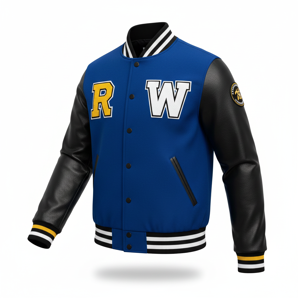 • Bold “R” and “W” Patches: Prominent, richly textured chenille-style “R” (yellow with white outline) and “W” (white with black outline) patches are proudly displayed on the chest, allowing for personalization or representing a group/team. (These can be described as customizable or placeholder letters).