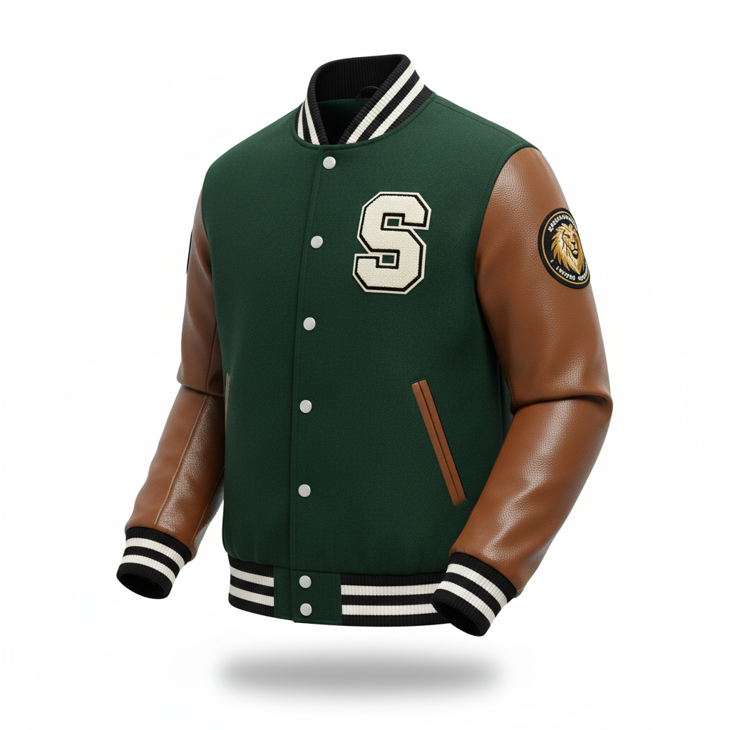 Embrace iconic American style with our Heritage Green & Cognac Varsity Jacket, a masterfully crafted piece that blends classic athletic aesthetics with premium materials and sophisticated details. Featuring a rich forest green wool blend body and luxurious cognac faux leather sleeves, this jacket is designed for those who appreciate timeless fashion, exceptional quality, and a distinctive edge. It’s the ultimate statement piece for casual wear, showcasing spirit, and elevating your everyday look.